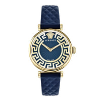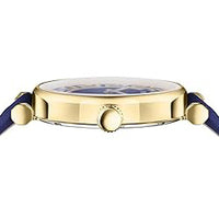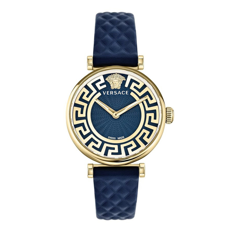 Movement: Swiss Made Quartz Movement. Case: 35mm x 8mm Gold Plated 316L Stainless Steel Case - Anti-Scratch Sapphire Crystal - Push/Pull Crown - Solid Caseback with Medusa Head Engraving. Dial: Blue Guilloché Dial - Gold Plated Stainless Steel Luminous Hour and Minute Hands - Versace Medusa Logo at 12 O'Clock...